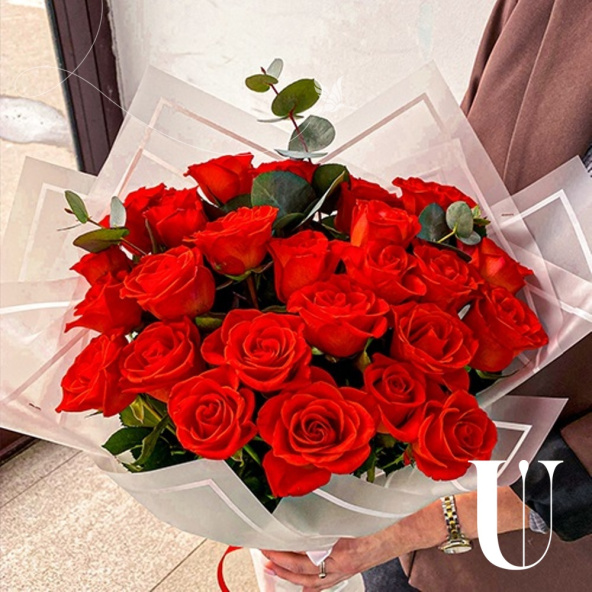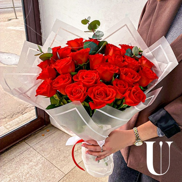 25 ярких коралловых роз с эвкалиптом и писташем в пленке