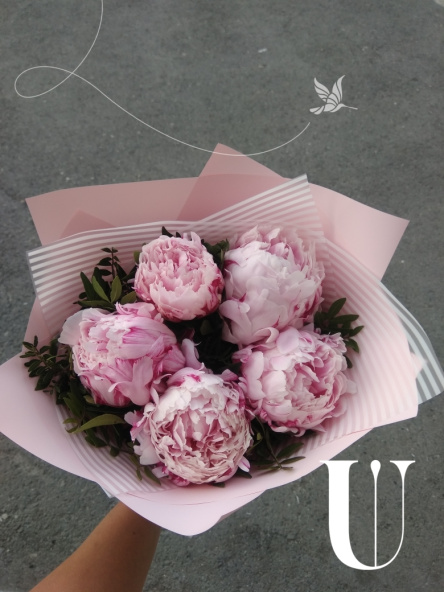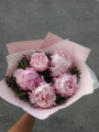 Букет из 5-ти ароматных Голландских пионов сорта Сара Бернар с добавлением микса из эвкалипта