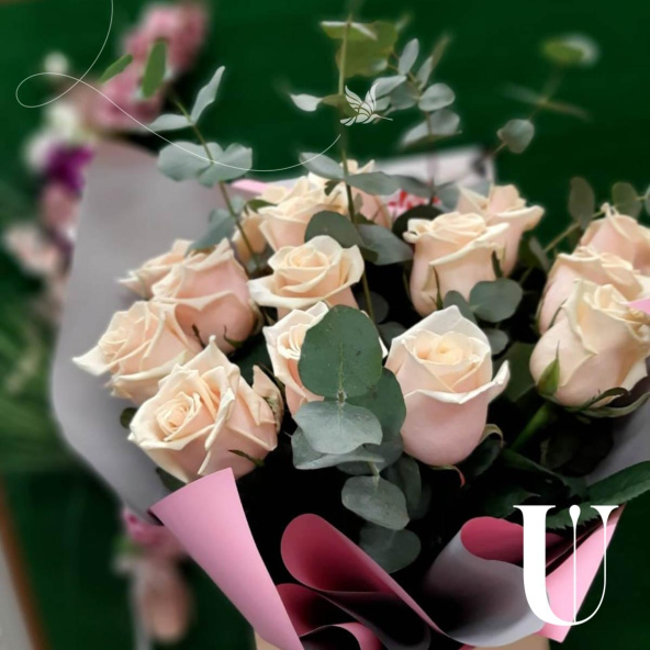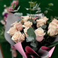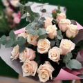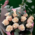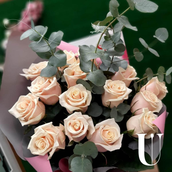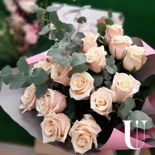 15 роза высотой 60 см Российских теплиц, собранная в букет с эвкалиптом в матовой пленке перевязанная лентой. Легкий не навязчивый душистый букет