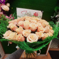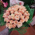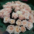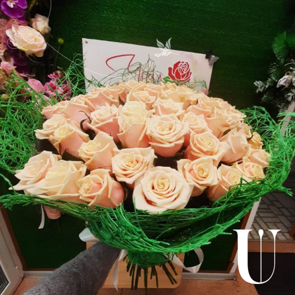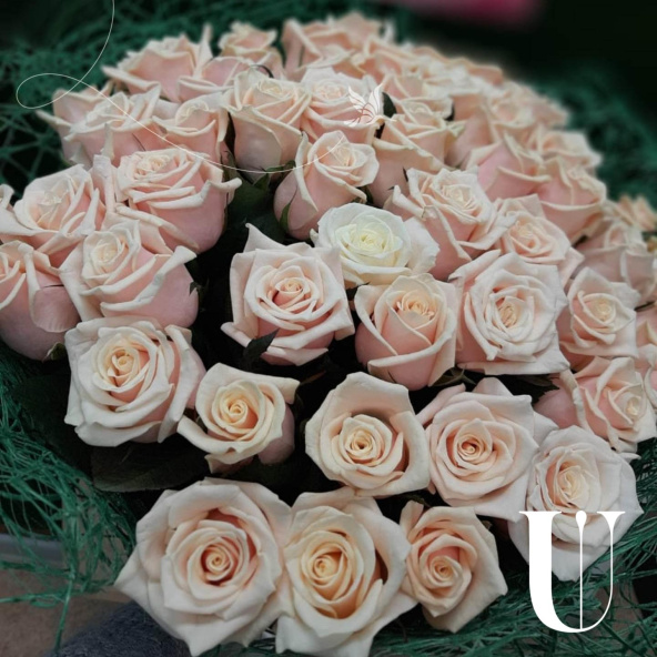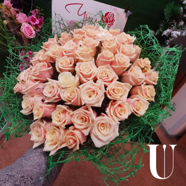 Шикарный букет из 51 розы цвета слоновой кости с легкой розовинкой в центре бутона смотрится эффектно и нарядно