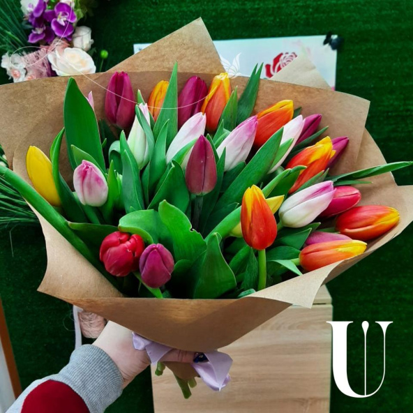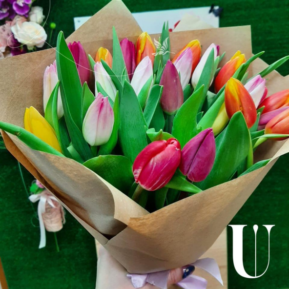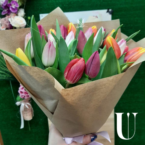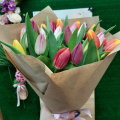 35 тюльпаны МИКС в модной крафт бумаге смотрятся очень красиво и достойно. На выбор можем сделать в фетре - не менее эффектно!