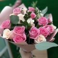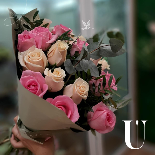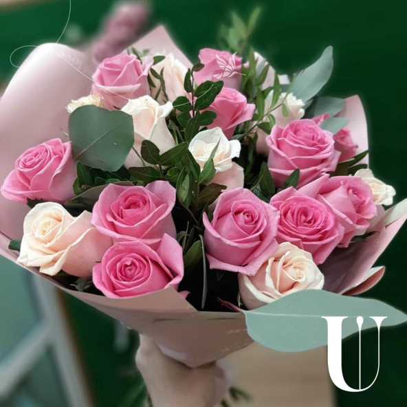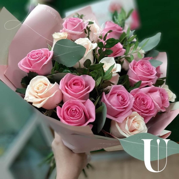 Моно букет из роз в розово-кремовых тонах с зеленью — модная тенденция этого года