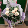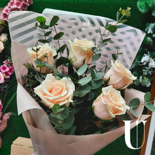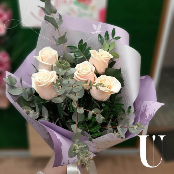 5 кремовых роз с ароматным эвкалиптом. Не дорогой букет из 5 роз на любой мотив. Розы порадуют взгляд любого, будь то ваш коллега по работе, знакомый, у которого день рождения, или кто-то из ваших близких