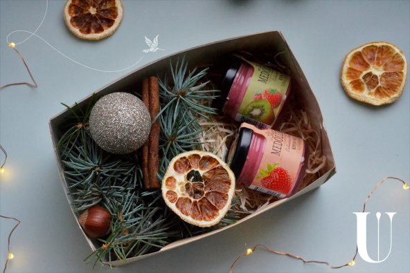 Новогодняя композиции из датской декоративной ели нобилис и 2е баночки мёда
