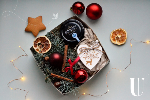 Новогодняя композиции из датской декоративной ели нобилис + баночка мёда и набор для глинтвейна